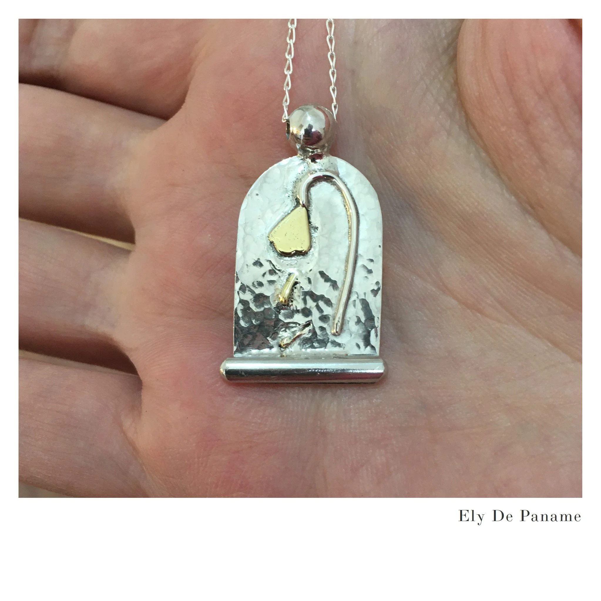 D’abord la cloche de verre est devenue une plaque d’argent martelée, elle donne les contours du bijou et supporte le reste de la structure. Le plateau est en demi-jonc en argent et la frêle tige de la fleur est également en argent 925. La fleur et ses pétales sont en laiton, pour trancher avec le reste et apporter de la couleur. Noyés dans les éclats de lumière attrapés par le martelage du fond, les détails en laiton sont très visibles ou très discrets suivant les angles. Autant vous dire que c’est un bijou auquel il est difficile de rendre grâce en le photographiant !