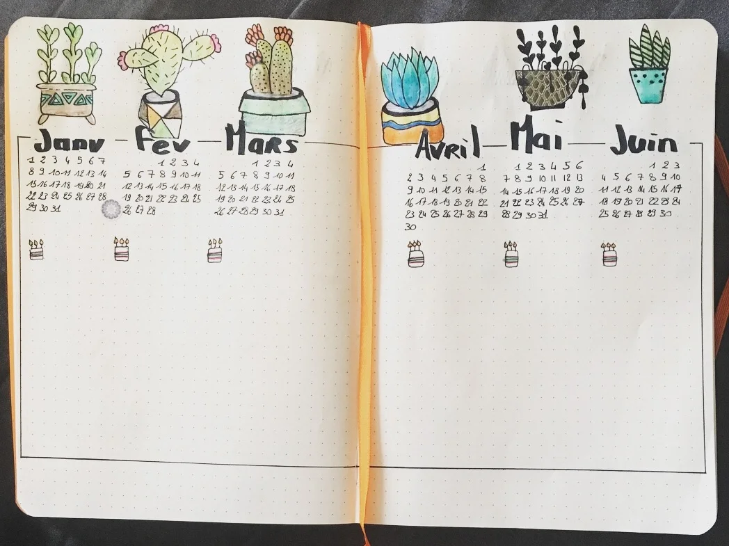 Voilà mes doubles pages annuelles. J’y ai depuis ajouté les anniversaires de mes proches et les rendez-vous et événements des mois à venir.
