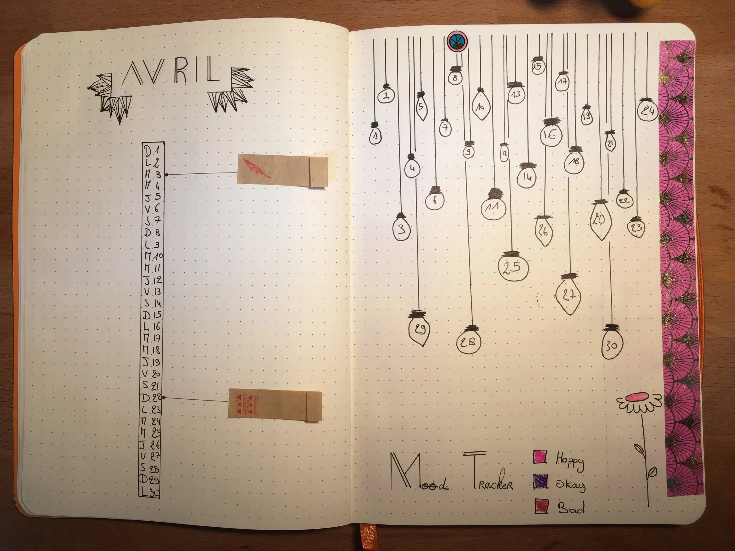 J’ai fait le choix d’avoir une double page mensuelle avec un calendrier du mois et un mood traker. Je reporte sur le calendrier les anniversaires et les rendez-vous, ici cachés par des petits papiers.